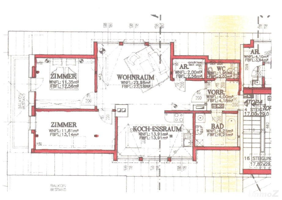 Vorraum, Bad mit Dusche, Fenster, WC extra, Küche möbliert mit angrenzendem Wohnraum, 2 Schlafzimmer