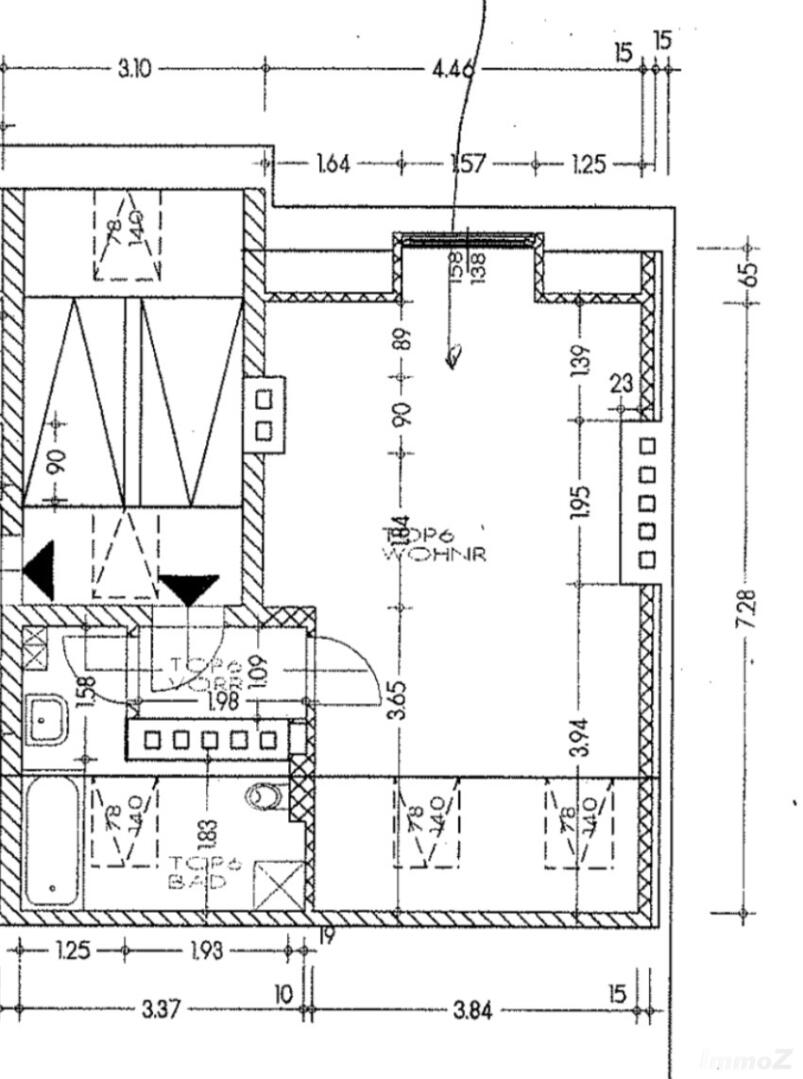 Aufteilung: Vorraum, Bad mit WC, Wohn-Ess-Küche. (neu möbliert)