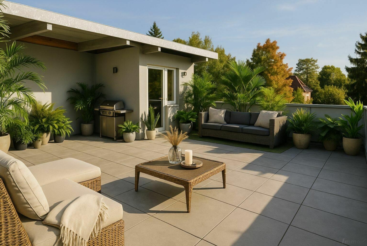 Die großzügige Dachterrasse mit Strom- und Wasseranschluss bietet Sonnenstunden von früh bis spät – ideal zum Entspannen!