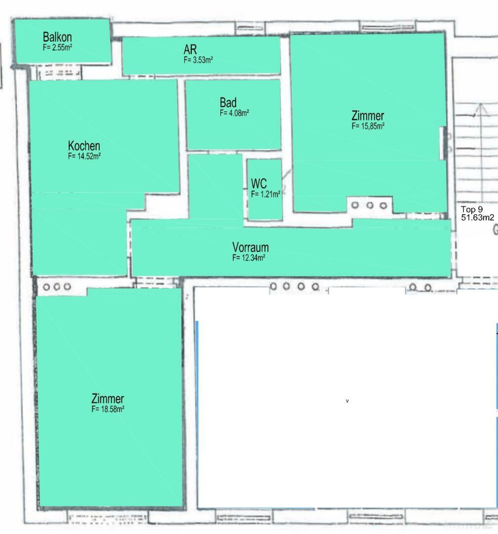 Wohnungsgröße von ca. 72,86 m2 mit Vorraum, extra WC, Bad mit Wanne, Küche möbliert (extra Raum) mit Zugang zur Loggia und Abstellraum, 2 großzügige extra Zimmer.